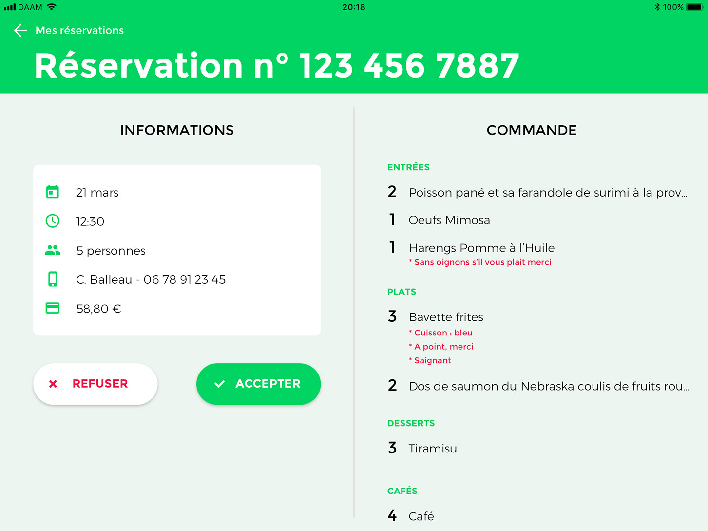 L’utilisateur peut commander et payer ses plats à l’avance pour ne plus patienter en restaurant, il peut également y ajouter des informations supplémentaires (cuisson, allergies alimentaires...).