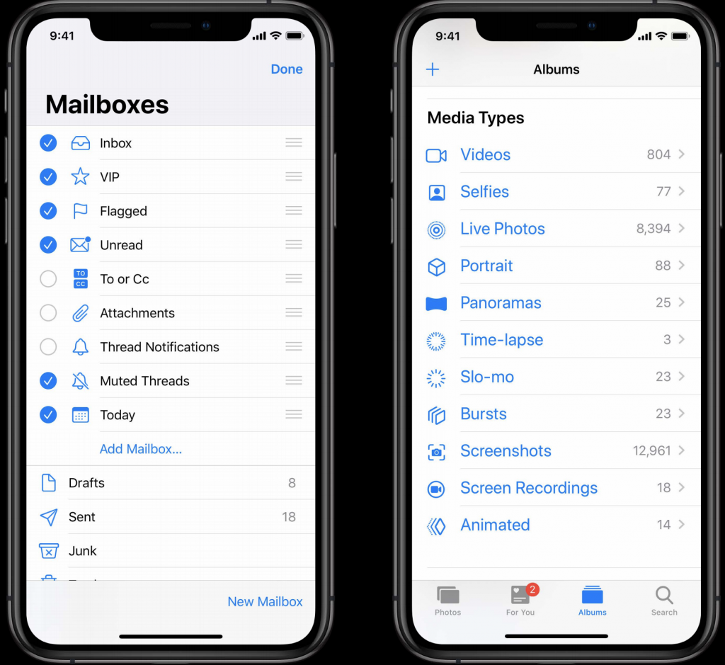 Déjà en place sur les dernières versions d’Android, le “dark mode” (traduisez “mode sombre”) débarque sur iOS 13. Fini le thème clair par défaut des appareils iOS, vous pourrez désormais choisir de visualiser vos applications sur un thème foncé.